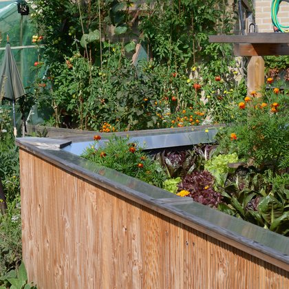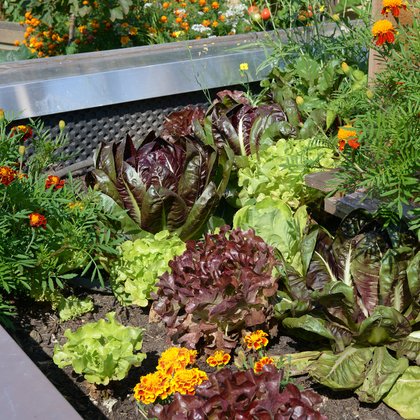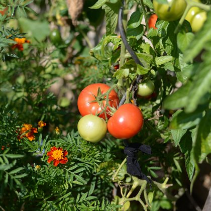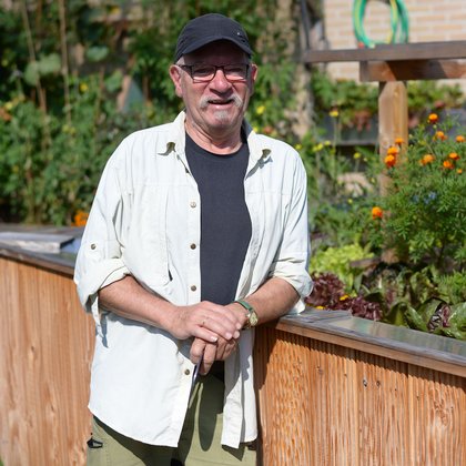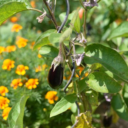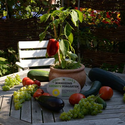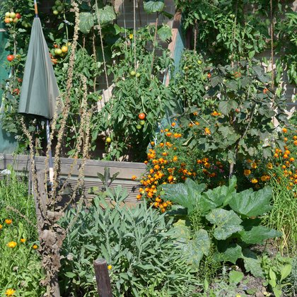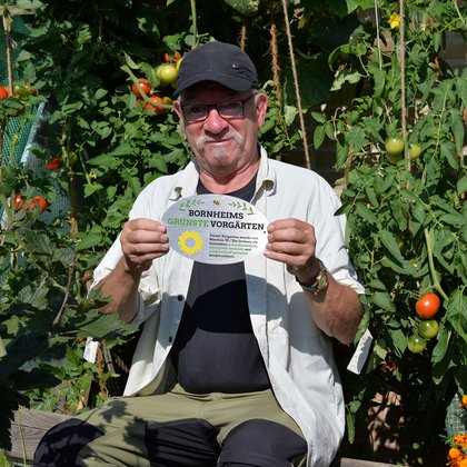 Alles hier kann man leider nicht essen, aber wie oft sieht man schon Auberginen und Tomaten im Vorgarten? Der Vorgarten des kleinen Reihenhauses im Europaring 48 in Sechtem hat trotz seiner geringen Größe viel zu bieten: vor allem viele Nutzpflanzen, sei es im eigens gebauten Hochbeet oder zu ebener Erde, aber auch Wildpflanzen, die durch ihre Blütenpracht und als Nahrungsquelle für Insekten bestechen. Drei Weinstöcke umrunden eine kleine Sitzecke und fungieren zudem als natürliche Klimaanlage fürs Haus. Mehr Biomasse pro Grundfläche wird man so schnell in keinem anderen Vorgarten finden, da ist sich Berthold Lehn ganz sicher.
