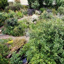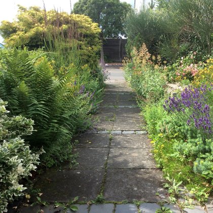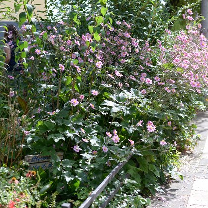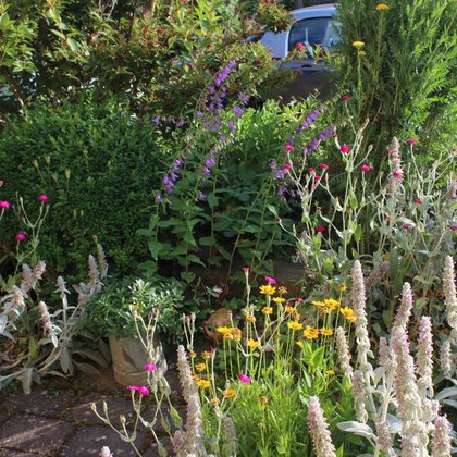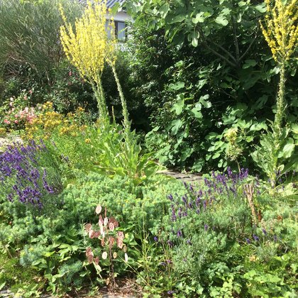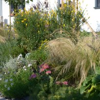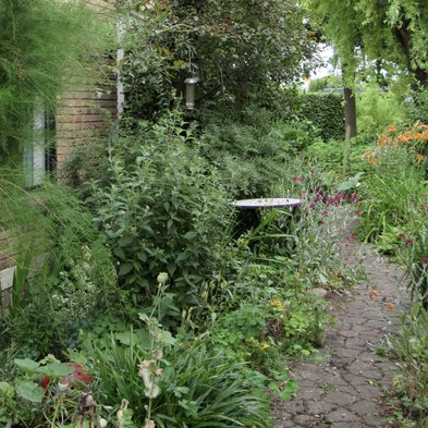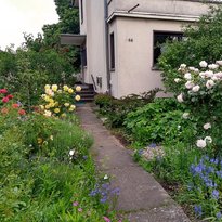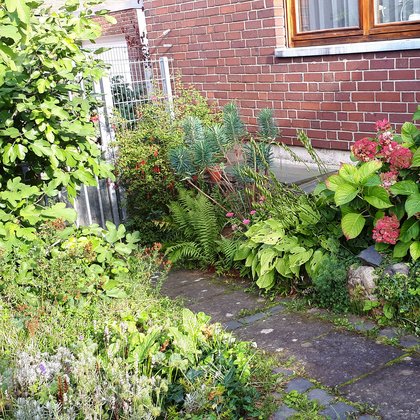 Maria Heinen möchte durch ihre Art der Gartenpflege der schwindenden Artenvielfalt entgegenwirken. In ihrem Vorgarten dürfen Sträucher und Stauden ineinander wachsen und sich zu einem organischen Ganzen verbinden. Einheimische Wildpflanzen, wie Königskerze und Schafgarbe, finden sich von alleine an geeigneten Stellen ein und werden in Vielzahl wachsen gelassen. Der Vorgarten besticht durch die grosse Zahl an unterschiedlichen Pflanzen und die Vielfalt an Kleinstlebensräumen, die u.a. durch alte Pflastersteine und Steinbrocken geschaffen wurden.