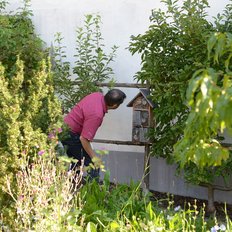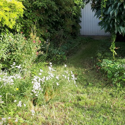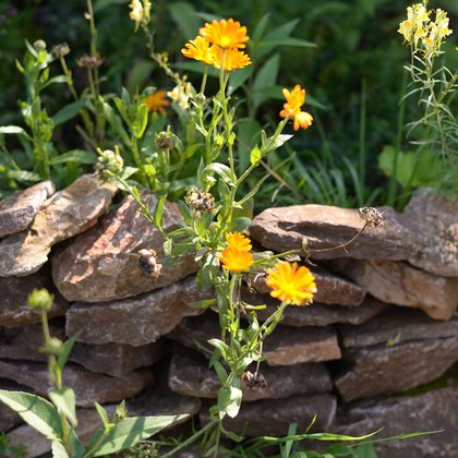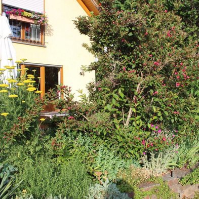 Das Ehepaar Behr legt nicht nur viel Wert auf einen grünen Vorgarten, sondern auch darauf, ein offenes Haus zu sein. Daher beherbergt ihr Vorgarten in der Elsa-Brädnström-Straße 7 in Sechtem nicht nur eine Vielzahl heimischer und insektenfreundlicher Pflanzen, sondern auch eine zur Straße hin gelegene Terrasse. Damit die frischen Haselnüsse vom Strauch auch gleich verspeist werden können, liegt immer ein Stein zum Öffnen der Nüsse bereit - ein Angebot, das v.a. von den Nachbarskindern gerne genutzt wird. Die Steine der selbsterbauten Grauwackemauer stammen aus einem regionalen Steinbruch, auch hierauf legt das Ehepaar Wert. Während zur Straße hin Ordnung herrscht und der Gehweg von "Unkraut" freigehalten wird, darf im Vorgarten selber auch mal etwas neben dem Beet wachsen. Noch ein wenig wilder geht es im Garten hinterm Haus zu, auf den wir auch einen Blick werfen durften. Hier wachsen zwischen Obst und Gemüse für den Eigenverzehr auch allerlei Kräuter und Wildblumen, die viele von uns gar nicht mehr kennen. Ein kleines Paradies für Mensch und Tier zugleich.