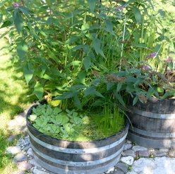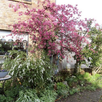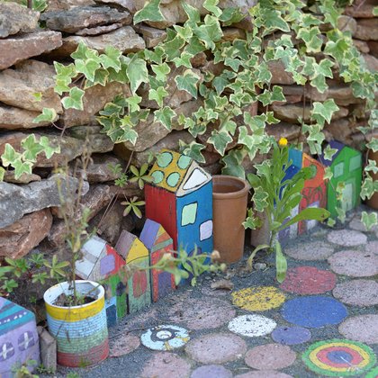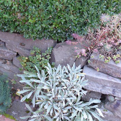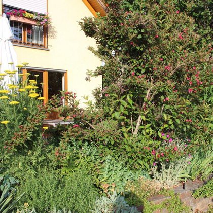 So könnte man diesen kleinen fröhlich-bunten Vorgarten in der Wolfsgasse 10 in Sechtem wohl am ehesten beschreiben. Bei aller Verspieltheit und Kreativität kommt aber auch der ökologische Nutzen nicht zu kurz. Gerade die Natursteinmauer bietet zahlreichen Lebewesen einen Unterschlupf und Lebensraum. Über die tierischen Bewohner und Besucher des Vorgartens, die auch mit einer Futterstation am Fenster beglückt werden, freut sich dann die ganze Familie Münch.