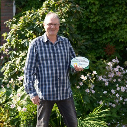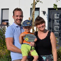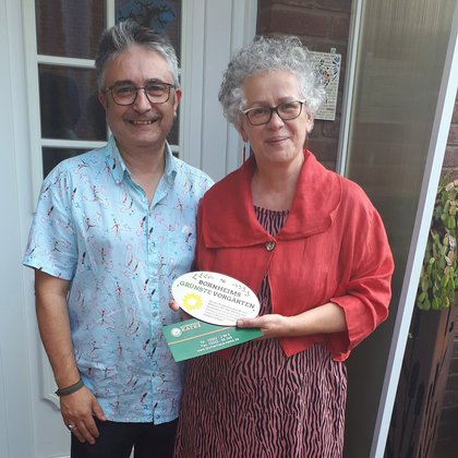 Während die meisten Vorgärten in diesem kleinen Neubaugebiet in Dersdorf noch mit Folie bedeckt sind, erstrahlt der Vorgarten der Jörg-Immendorff-Str. 10 schon in den prächtigsten Farben. In nur wenigen Monaten aber dafür mit sorgfältiger Planung und intensiver Recherche entstand hier ein wahres Paradies für Insekten mit allerlei heimischen Pflanzenarten. Die Arbeit und Mühe, aber auch das Herzblut, das in diesen Vorgarten gesteckt wurde, blieben nicht lange unbemerkt von den Nachbarn, die ihn sogleich nominierten. So war es für uns eine besondere Freude, diese allererste Plakette als Überraschung zu überreichen.