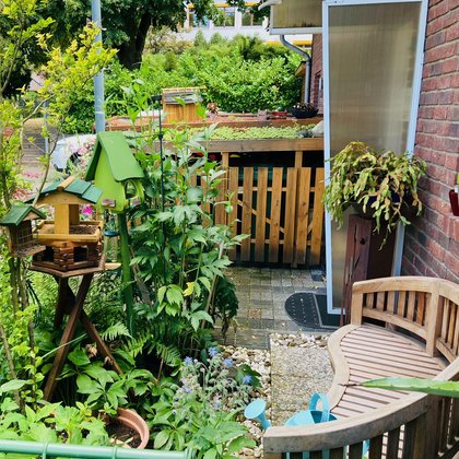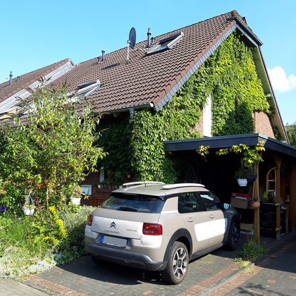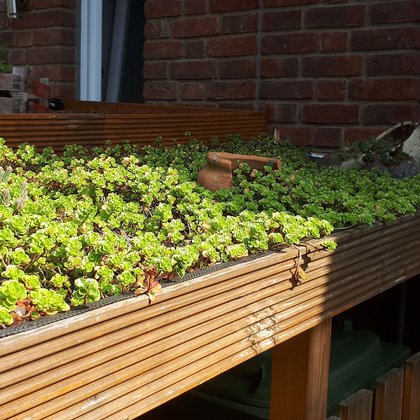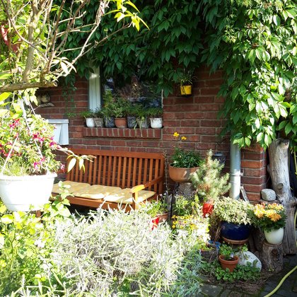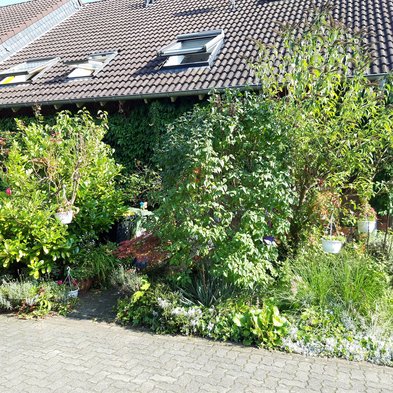 Statt die Fläche als Stellplatz fürs Auto zu nutzen, wie die meisten in ihrer Nachbarschaft, haben sich die Eheleute Colditz ein kleines grünes Paradies vor ihrer Haustür geschaffen. Trotz der geringen Größe ist der Vorgarten des Sebastianusweg 12 in Roisdorf sehr vielfältig begrünt. Pflanzsteine und Gefäße bieten viele Kleinnischen für Tiere, eine gemütliche Sitzecke lädt zum Verweilen und Natur genießen ein. Um noch zusätzliche Grünfläche zu schaffen, wurde sogar der Mülltonnenstellplatz begrünt. Eine tolle Idee für alle die noch etwas mehr Grün in ihren Vorgarten bringen möchten, ohne auf Platz zu verzichten.