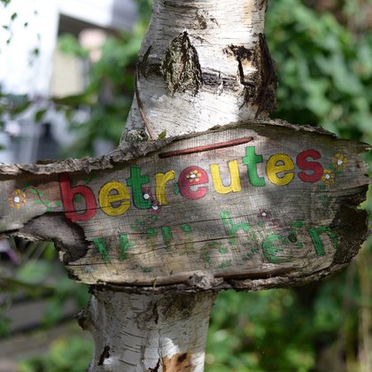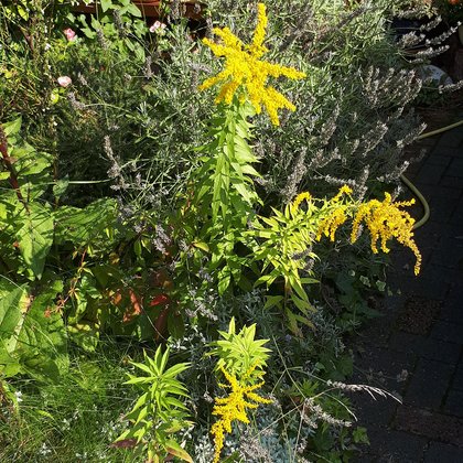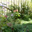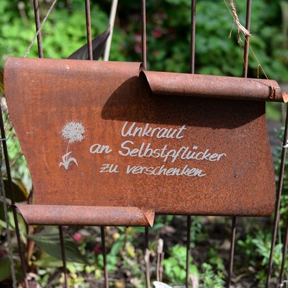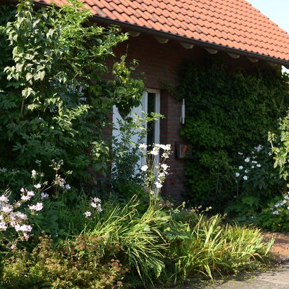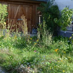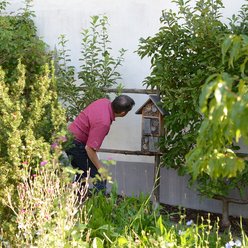 So heißt es zumindest auf einem leicht verwittertem Holzschild im Vorgarten von Christa Dross. Ein weiteres Schild zeigt an, dass es hier Unkraut zum Selberpflücken gibt. Ungepflegt sieht der Vorgarten der Gebrüder-Kall-Str. 13 in Sechtem dennoch nicht aus. Auch wenn dort mal das ein oder andere "Unkraut" stehen bleiben darf und nicht gleich jede selbst ausgesäte Pflanze entfernt wird, fügt sich doch alles zu einem harmonischen - und äußerst grünen - Gesamtbild, welches durch Pflanzenvielfalt und sich im Jahresverlauf wandelnde Blütenpracht besticht. Zwar konnten wir nicht alle der in der Bewerbung genannten tierischen Mitbewohner und Besucher antreffen, aber es besteht kein Zweifel daran, dass dieser Vorgarten vielen Tieren Futter und Unterschlupf bieten kann.