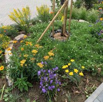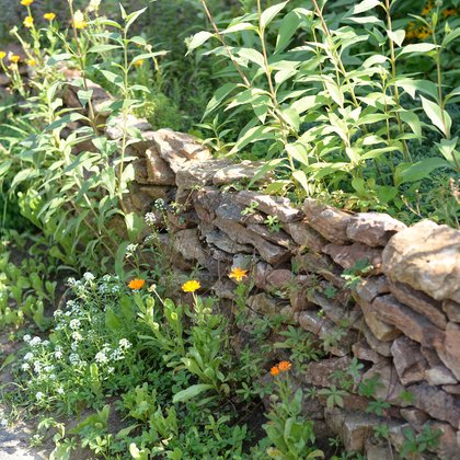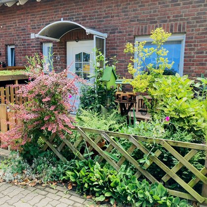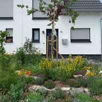 Als Petra Godel-Ehrhardt und Andreas Haack in ihr neues Haus zogen, standen sie vor der gewaltigen Aufgabe aus einem nahezu toten Steingarten mit vielen versiegelten Flächen und nur wenig Pflanzen einen lebendigen Vorgarten zu schaffen. Keine leichte Aufgabe, aber das Ergebnis nach 2 Jahren kann sich sehen lassen: Neben einer Vielzahl an Pflanzen, darunter Heilkräuter und Nützlingspflanzen, gibt es nun mehrere Trockenmauern, Totholz und Unterschlüpfe für Kleintiere und Insekten. Bei der Umgestaltung wurde der Vorgarten auch gleich zum Abhang hin mit einem Staketenzaun gesichert, sodass hier auch die Enkel spielen können. Auch der Garten hinterm Haus war recht steril gehalten und wurde von der leidenschaftlichen Naturgärtnerin und ihrem Mann nach und nach mit Leben und Vielfalt versehen. Dabei war es den beiden wichtig, die bestehenden Pflanzen soweit wie möglich zu erhalten und lediglich durch eine Vielzahl weitere Pflanzen zu ergänzen. Auch wenn die Umgestaltung noch nicht komplett abgeschlossen ist, ist der Vorgarten im Bannweg 62 in Dersdorf jetzt schon ein kleines Paradies.