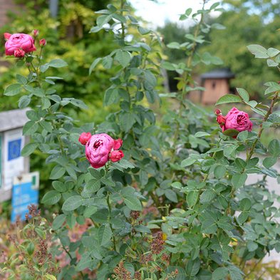 In dem eher freier gestalteten Vorgarten von Bernd und Milou Tönneßen in Roisdorf gibt es einiges zu entdecken! Hier stößt eine bunte Mischung aus heimischen Wildpflanzen wie Königskerze, Efeu, Flockenblume und Mauerpfeffer auf ausgewählte Zierpflanzen. Vor allem die Rosen überzeugen dabei nicht nur mit ihrer Schönheit sondern auch mit einem intensiven Duft. Da der Boden komplett mit Pflanzen bedeckt ist, trocknet der Vorgarten selbst in heißen Sommern nicht so schnell aus und bedarf entsprechend wenig Pflege. Auch verblühte Pflanzen und eher unbeliebte Vertreter wie Kratzdisteln finden dabei ihren Platz und bilden so einen wichtigen Baustein für die Artenvielfalt. Das Gesamtbild mag nicht den Geschmack von jedem treffen, doch es zeigt die Liebe zur Natur der beiden, die als Biobauern den Wert der Insekten- und Pflanzenvielfalt zu schätzen wissen.