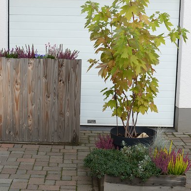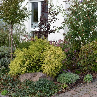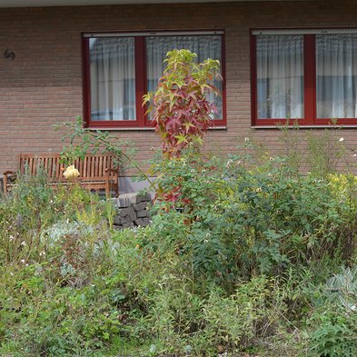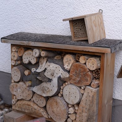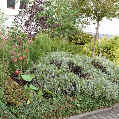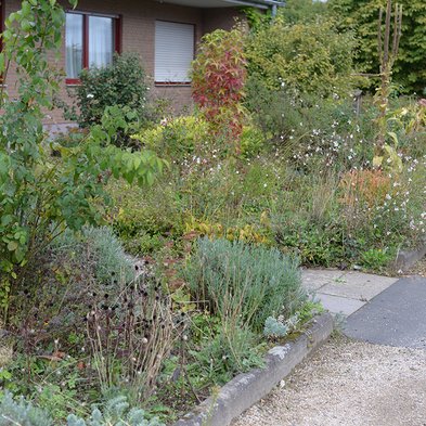 Der Vorgarten von Annegret Meyer-Nieuwenhuis aus Sechtem beweist, dass man auch mit wenig Fläche viel für die Artenvielfalt machen kann, ohne sein Grundstück verwildern zu lassen. Neben Eisenkraut, Lavendel, Borretsch und Rosmarin sowie vielen weiteren bienen- und insektenfreundlichen Pflanzen, die hier übers Jahr verteilt blühen, gibt es in diesem Vorgarten auch ein Insektenhotel und eine Wasserstelle. Ein kleines Highlight ist auch das Apfelbäumchen, das uns bei unserem Besuch geradezu anstrahlte mit seiner üppigen Pracht. Um die Fläche vorm Haus weiter zu begrünen, wurde auf der Einfahrt noch ein kleines Beet angelegt und auch der Verschlag der Mülltonnen begrünt. An die Jahreszeiten angepasste Zierpflanzen zur Dekoration runden die Gestaltung ab.