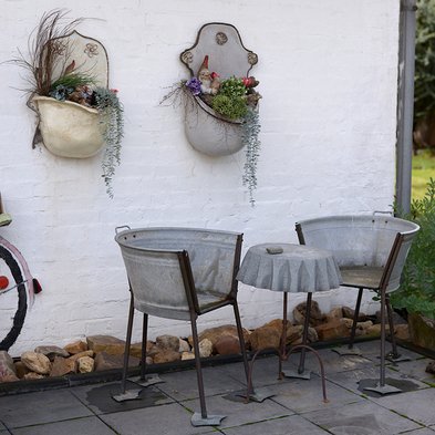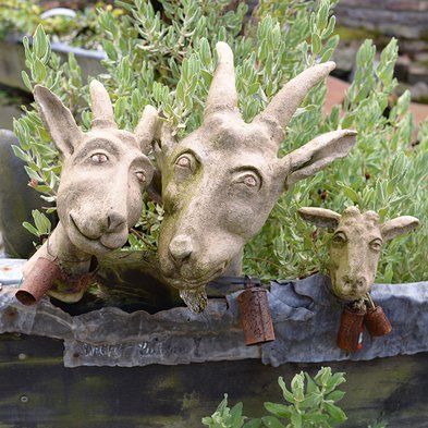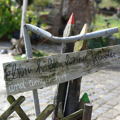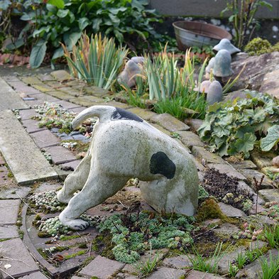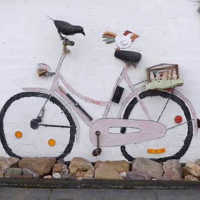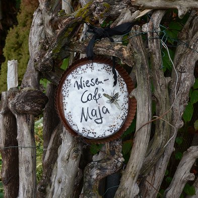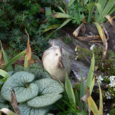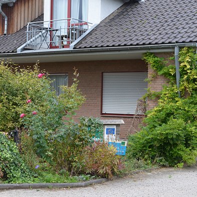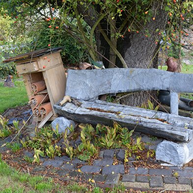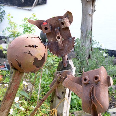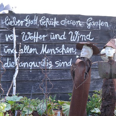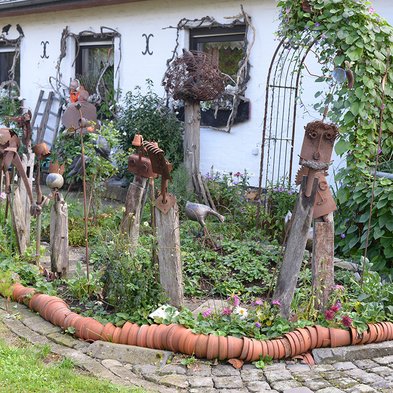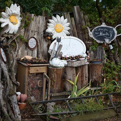 Ein mit der Wand verschmolzenes Fahrrad, getöpferte Ziegenböcke, die über den Zaun schauen und Stühle aus Zinnwannen. Der Vorgarten von Frau Klein im Herrenhäuschenweg in Merten gleicht fast schon einer öffentlichen Kunstaustellung. Mit viel Liebe zum Detail und zur Natur, sowie einer großen Portion Humor hat sie hier eine einzigartige Mischung geschaffen, die Mensch und Tier gleichermaßen erfreut. Dabei verschmelzen immer wieder Kunst und Natur. So dienen zum Beispiel Skulpturen aus Holz und Metall als Rankhilfen für Tomaten. Besonders gerne nutzt sie für ihre Kunst gebrauchte Gegenstände und Materialien, die andernfalls im Müll gelandet wären. Ein Highlight ist auch das Bienen-Café Maja, das sie auf der gegenüberliegenden Straßenseite errichtet hat. Hier finden Bienen und andere Insekten jede Menge Totholz und ein Insektenhotel. Dabei ist alles so außergewöhnlich und liebevoll gestaltet, dass es auch Passanten immer wieder zum Schmunzeln bringt. Witzige Sprüche, originelle Figuren und eine bunte Mischung der schönsten heimischen Pflanzen - in diesem Vorgarten findet fast alles einen Platz, Hauptsache es ist nicht langweilig!