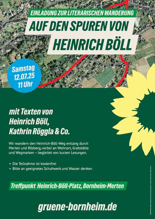 Am Samstag, dem 12. Juli, laden die Bornheimer Grünen zu einer literarischen Wanderung auf dem Heinrich-Böll-Weg ein. Anlass ist der 40. Todestag Heinrich Bölls – Ehrenbürger Bornheims, Literaturnobelpreisträger und unbequemer Demokrat.