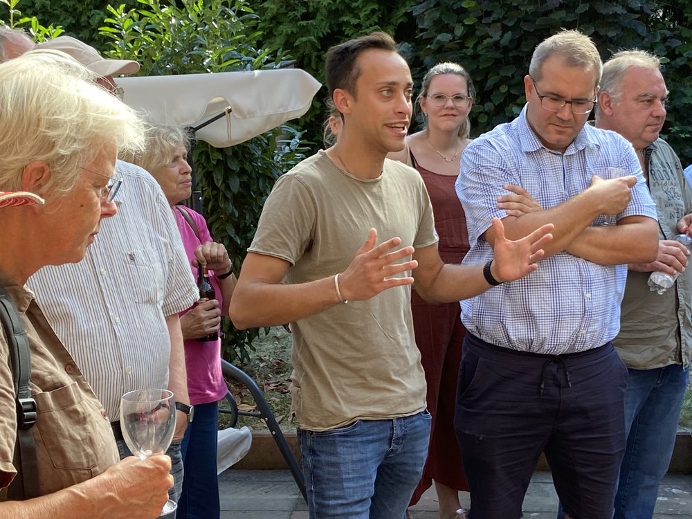 Zu den 60 Gästen auf dem Sommerfest in einem zauberhaften Garten in Hemmerich zählten neben den Grünen aus Bornheim und Umgebung auch Vertreter*Innen anderer Parteien, Vereine und Initiativen. Bürgermeister Christoph Becker lobte den angesichts vieler Krisen immer noch konstruktiven Umgang miteinander in Bornheim. Er freue sich auch über das "schöne Wetter", allerdings könne man wegen der Trockenheit kaum von „gutem Wetter“ sprechen. „Stargast“ des Sommerfests war der neue Grüne Landesvorsitzende Tim Achtermeyer (Bonn), der an die enge Verbindung der Grünen NRW mit Bornheim erinnerte, wo der Landesverband vor 40 Jahren in der Herseler Rheinhalle gegründet worden war. Er freue sich, dass auf dem Sommerfest so viele verschiedene Vertreter*Innen der Gesellschaft zusammengekommen seien und miteinander sprächen: Dies sei der richtige Weg die Herausforderungen der nächsten Jahre anzugehen.