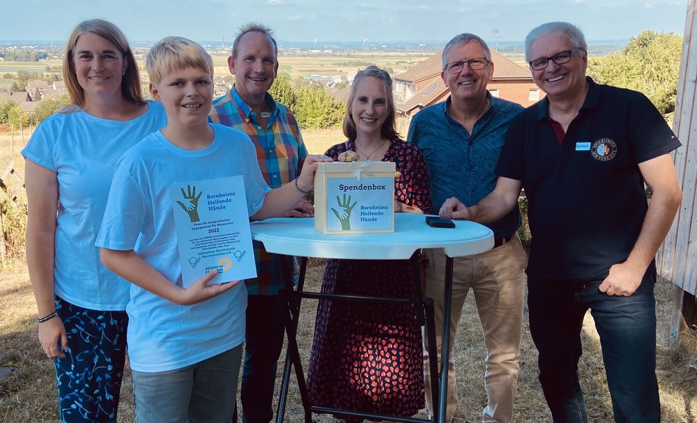 Im Rahmen ihres diesjährigen Sommerfestes mit rund 60 Gästen überreichten die Bornheimer Grünen ihren Preis „Bornheims Helfende Hände“ an den neugegründeten inklusiven Bornheimer Sportverein „Sporteinander e.V.“. Grünen-Sprecherin Cynthia Roggenkamp betonte, dass bei „Sporteinander“ der Mensch, der Spaß und die Freude an der Bewegung zähle, sodass sich jede und jeder nach seinen oder ihren Fähigkeiten mitmachen könne und sich wertgeschätzt fühle. Christine Nett, ihr Sohn Basti sowie Norbert Helding von „Sporteinander“ freuten sich über die Würdigung ihres Engagements und luden dazu ein, Vereinsmitglied zu werden oder finanzschwache Mitglieder durch Patenschaften zu unterstützen.