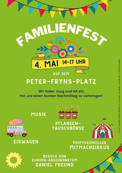 Wir, Bündnis 90/Die Grünen Bornheim, möchten Sie alle herzlich zu unserem Wahlkampfauftakt zur Europawahl mit einem Familienfest auf dem Peter-Fryns-Platz in Bornheim einladen.
