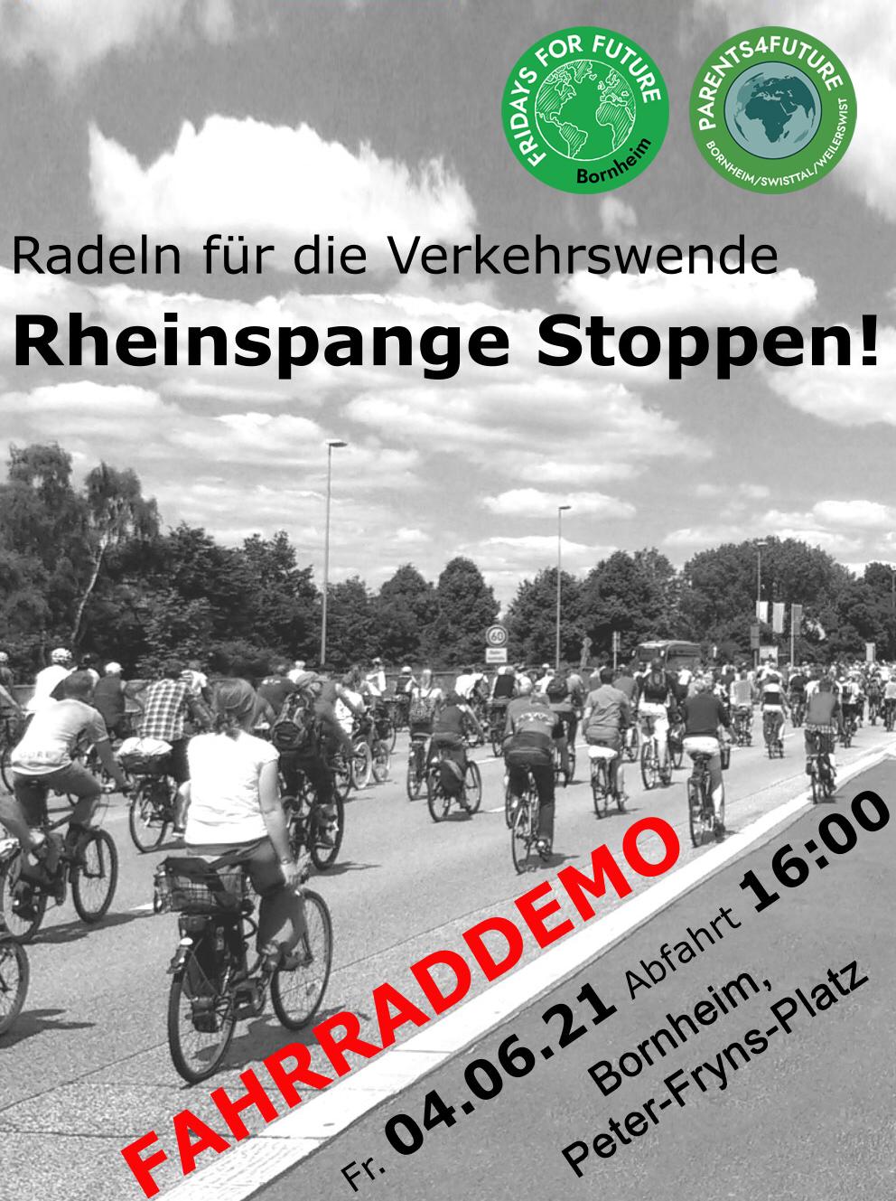 Gleichzeitig soll der rechtsrheinische Radler-Demo-Zug an der gegenüberliegenden Nato-Rampe in Niederkassel eintreffen. Wir werden uns begrüßen mit Winken und Fahrradklingeln und unsere Transparente schwenken. Wir zeigen damit, dass der Widerstand gegen die Rheinspange auf beiden Seiten aktiv ist.
